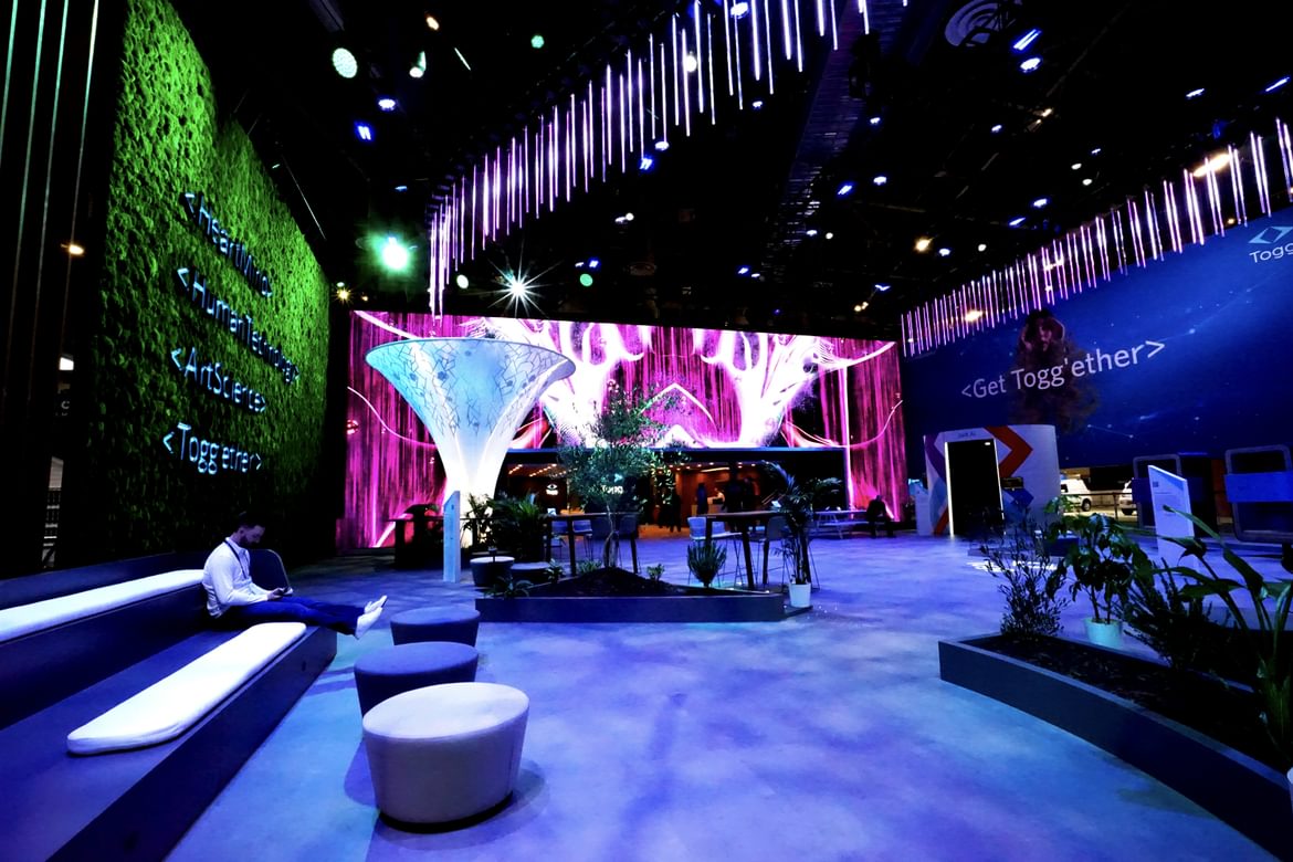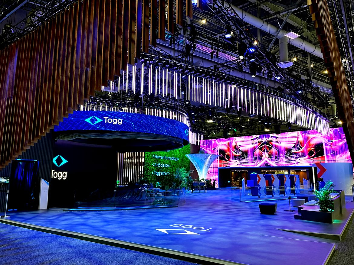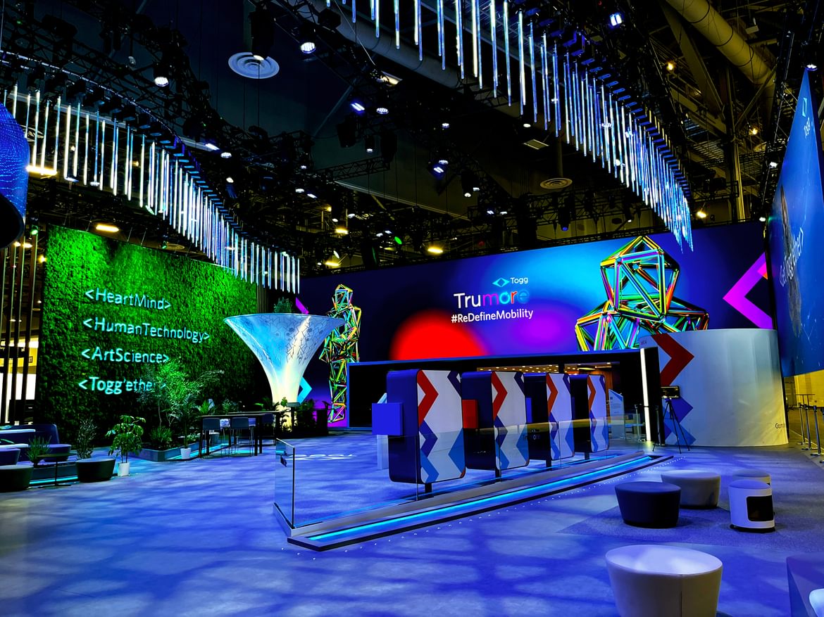 The booth also featured an interactive room with curved screens, inviting visitors to engage in a playful and immersive experience. As attendees danced within the space, their real-time digital avatars came to life on the screens, perfectly mirroring their movements. This innovative, entertaining feature captivated visitors, showcasing Togg's ability to seamlessly integrate cutting-edge technology into their booth design and provide a memorable, interactive experience.