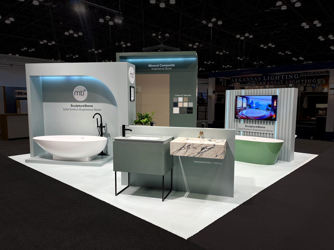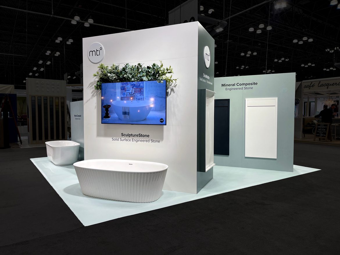 The sophisticated booth perfectly embodied MTI Baths' identity, utilizing a monochromatic color scheme with pastel hues that harmonized with their product offerings and a mid-century modern style for a timeless appeal.